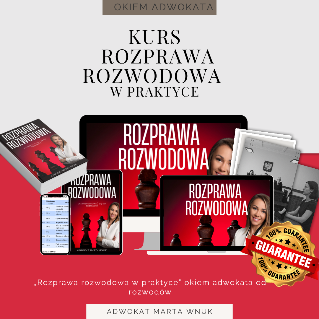 • Kurs online „Rozprawa rozwodowa w praktyce” – 14 lekcji wideo, ponad 4 godziny nagrań prowadzone przez adwokata specjalizującego się w sprawach rodzinnych.